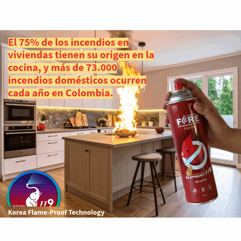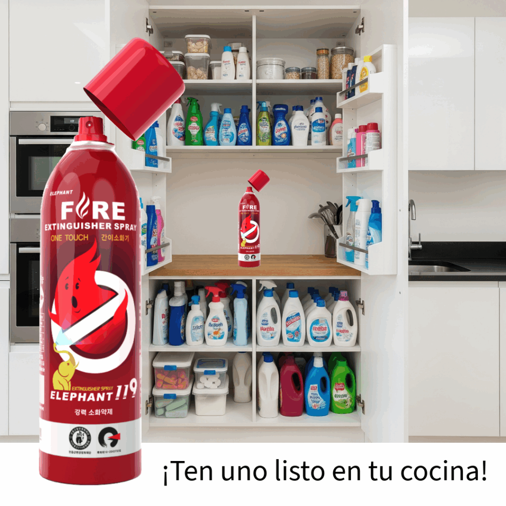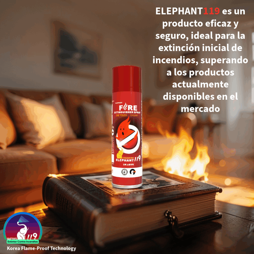 Extintor portátil ELEPHANT 119: Aerosol que no explota, apaga fuegos en 1 minuto. Ideal para baterías de litio clase D, ABC, uso 360°, Protege tu vida y bienes. Amigable con el medio ambiente.